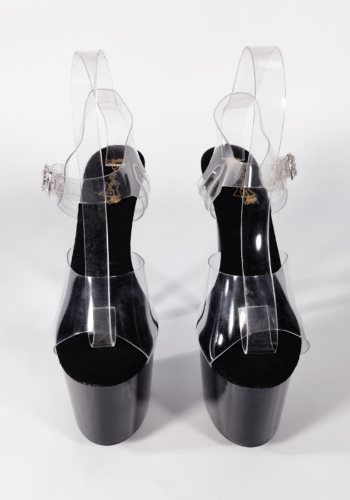 Seksowne transparentne szpilki na czarnej platformie, buty erotyczne do tańca exotic i pokazów scenicznych