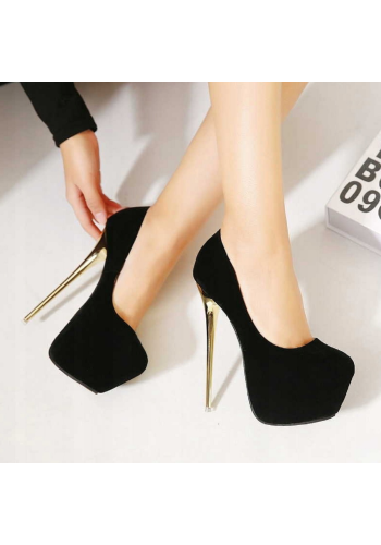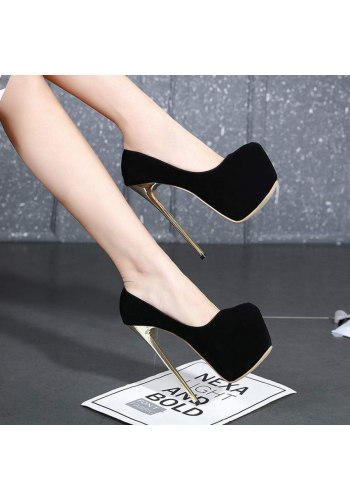 Seksowne czarne zamszowe szpilki na złotym obcasie, erotyczne buty damskie na platformie